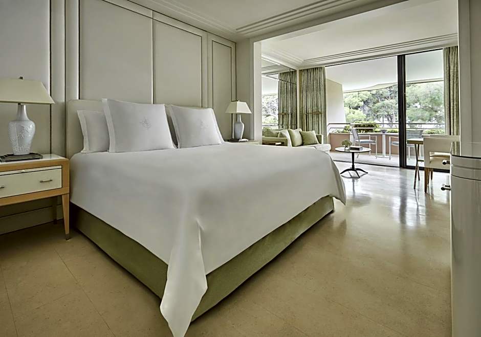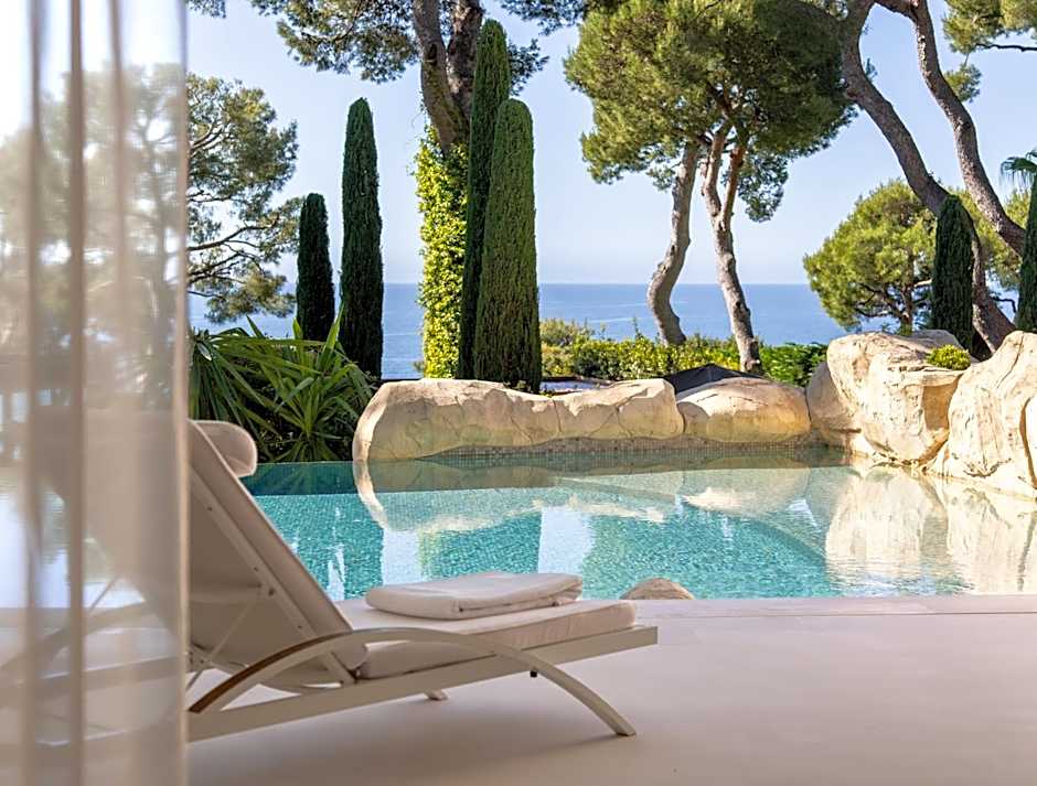 Located on the ground level of the Terrasses du Cap, this suite offers a living area and a bedroom with French doors opening onto a terrace with a private pool overlooking the pine grove. It is equipped with a walk-in wardrobe and an ensuite marble bathroom with bath and shower.